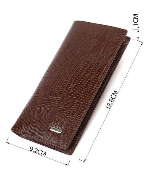 Відмінний чоловічий гаманець із натуральної шкіри з тисненням під рептилію. Аксесуар має одне основне відділення для купюр усіх номіналів, одинадцять осередків для карток, кишеню під сіточкою для пропуску, дві приховані кишені та монетницю на блискавці. Закривається аксесуар навпіл без застібки. На лицьовій стороні, у правому нижньому куті металевий логотип компанії виробника. Купуючи шкіряний аксесуар цієї фірми, собі або на подарунок, будьте певні, що він прослужить Вам не один рік.