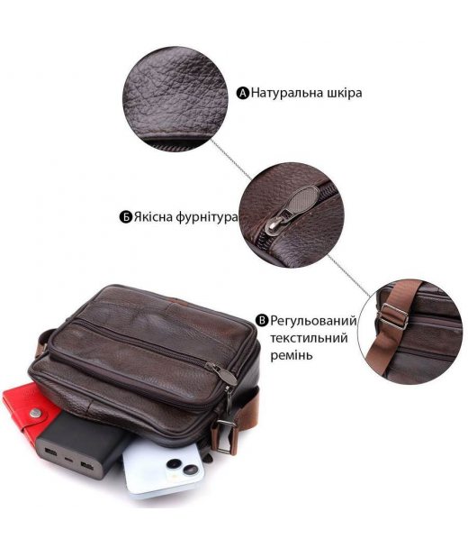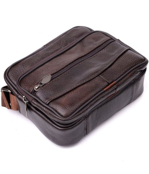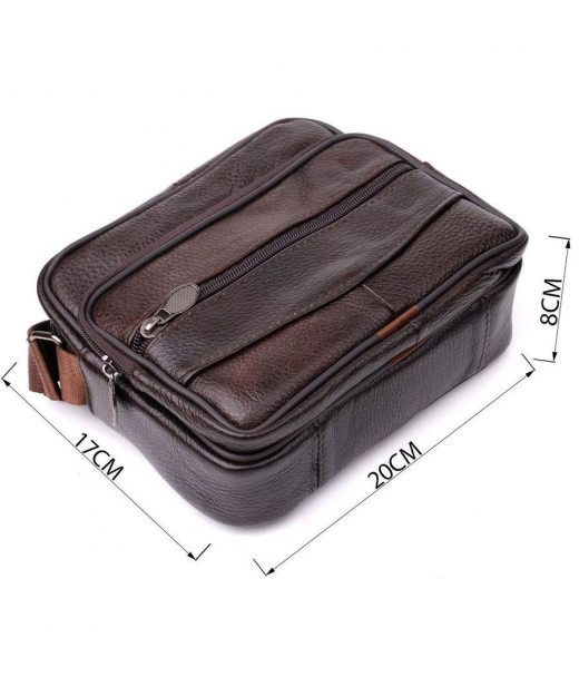 Стильна чоловіча сумка з високоякісної натуральної шкіри, стійка до пошкоджень та зношування. Ефектний та практичний аксесуар з одним основним відділенням та трьома додатковими кишенями для зберігання аксесуарів, телефону та інших дрібниць. Ремінь сумки виконаний із міцного текстилю та регулюється по довжині, що забезпечує зручність при носінні. Благородний коричневий колір моделі робить її універсальною та ідеально придатною як для повсякденного використання, так і для ділових зустрічей. Ця сумка стане чудовим вибором для чоловіка, що цінує комфорт та стиль у кожній деталі.