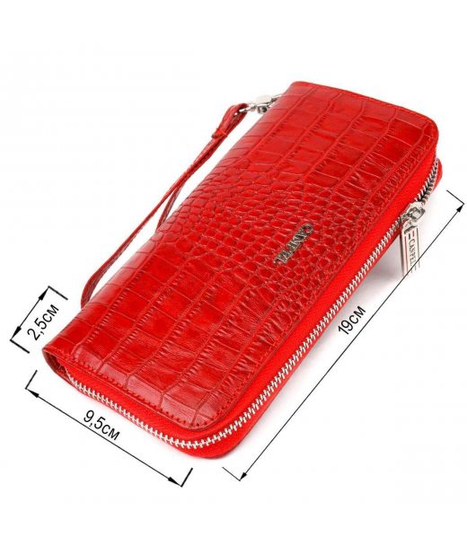 Чудовий жіночий гаманець з натуральної шкіри з тисненням під крокодила. Аксесуар має три основні відділення, в які поміщаються купюри всіх номіналів, дві перегородки, одна з них на блискавці, вісім кишень для карток, дві прилеглі кишені та знімний кистьовий ремінь. Закривається аксесуар на блискавку. Відмінний аксесуар, надійного виробника, який прослужить дуже довго.