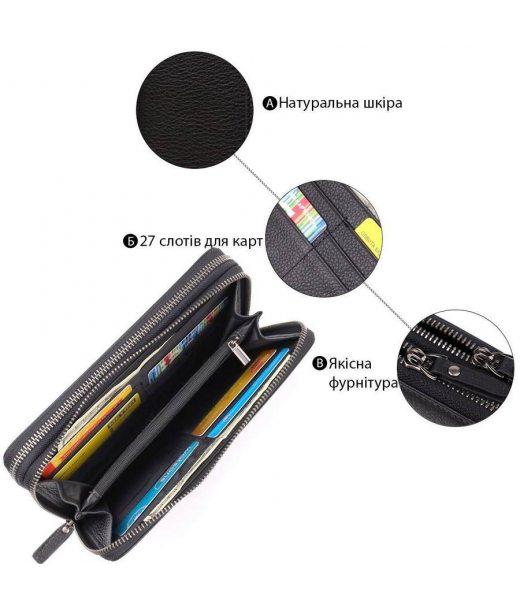 Модель складається із двох самостійних відділень, кожне з яких закривається на надійну блискавку. Усередині передбачені кишені для купюр, відділення на блискавці для зберігання цінних речей, а також безліч осередків для пластикових карток та документів. Така структура дозволяє зручно розподілити вміст та швидко знаходити все необхідне.