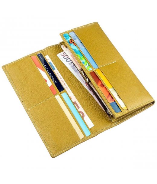 Гарний і екстравагантний жіночий гаманець незвичайного гірчичного кольору. Виконаний аксесуар з натуральної шкіри. Виглядає дуже модно і стильно. До всього цього гаманець ще і дуже практичний, тому що має всі необхідні відділення та кишені для Ваших цінностей. Всередині є три основних великих відділення для купюр, відділення на блискавці для інших цінностей, кишені для усіляких карт і зручна монетниця на металевій клямці. Також є одне зовнішнє містке відділення. Закривається цей гаманець на зручні магніти, які розташовані з боків. Упаковано виріб в білу картонну коробку.