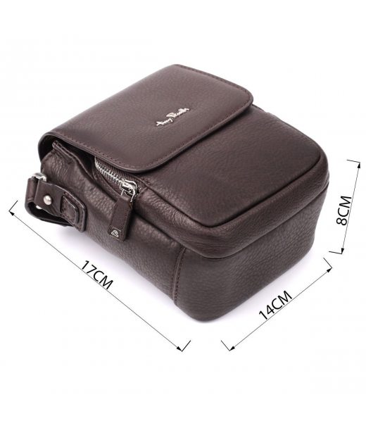 Сумка виготовлена з натуральної зернистої шкіри коричневого кольору. На лицьовій стороні розташований металевий логотип бренду, що підкреслює оригінальність та елегантність. Основне відділення закривається клапаном на магніт. Усередині передбачена відкрита кишеня, доповнена накладною кишенею на блискавці. На тильній стороні розташована вертикальна кишеня на блискавці. Сумка забезпечена брелком із двома металевими кільцями та незнімним брендованим текстильним ременем. Фурнітура виконана під срібло, що надає виробу сучасного та стриманого характеру.