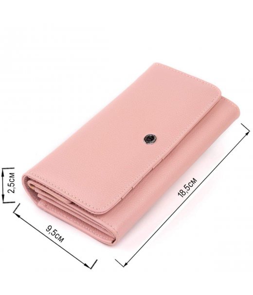 Елегантний жіночий гаманець з натуральної шкіри ніжного пудрового кольору. Шкіра, з якої виконаний гаманець дуже м'яка і еластична. По краях гаманець прошитий світлим рядком. Гаманець складається з двох автономних частин: для купюр і карток і відкритого відділення для особистих речей під кнопкою. На тильній стороні кишеню відкритого типу. На лицьовій стороні металевий логотип бренду. У комплекті до гаманця йде фірмова картонна коробка. Виріб стане прекрасним подарунком для близької людини.