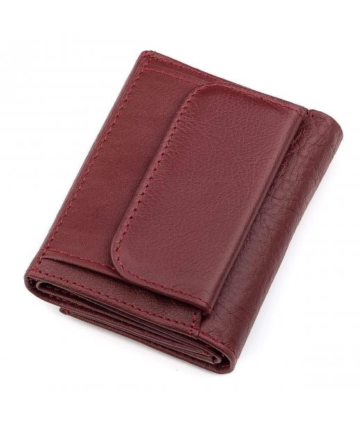 Гаманець яскравого і соковитого бордового кольору з натуральної фактурної шкіри підійде для кожної дівчини. Модель має невеликі розміри, а в якості фіксатора виступає металева кнопка. Зовні можна побачити відділення для монет. Щоб не обтяжувати аксесуар, всередині розташований мінімальний функціонал: пару відділень для паперових грошей і два слоти для пластикових карт.