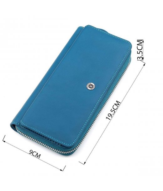 Представлена модель виконана в красивому бірюзовому відтінку, з якісної, натуральної шкіри. Закривається аксесуар на блискавку, що дозволяє на вищому рівні забезпечити безпеку вмісту, якого може бути дуже багато, адже завдяки непоганим розмірами доступна відмінна місткість. Зовні є також додатковий блок для платіжних карт, яких можна розміщувати 18 штук, разом з внутрішніми слотами. Порадує багатьох і приваблива упаковка, оформлена у фірмовому стилі з логотипом бренду.