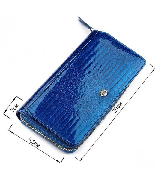 Представлений гаманець має прекрасний функціонал і цікавий дизайн, оформлений в синьому кольорі з малюнком під шкіру крокодила. Аксесуар має прекрасну практичність, внутрішню місткість для паперових банкнот і платіжних карток, яким також виділяється окремий блок, що фіксується на кнопку, дозволяє розміщувати до 20 карт. Порадує стильна фірмова коробка і надійна металева блискавка, завдяки якій жодна цінна купюра або річ не випаде назовні.