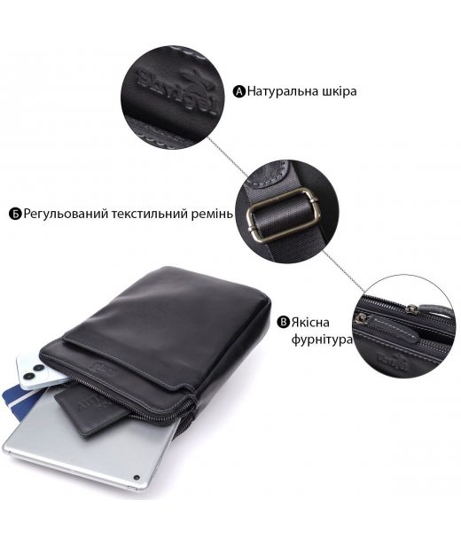 Чоловіча вертикальна сумка від українського бренду SHVIGEL, виготовлена з натуральної гладкої чорної шкіри, - це стильний аксесуар для сучасного чоловіка. Завдяки компактним розмірам та продуманій організації, у ній зручно носити документи, планшет чи щоденні речі.