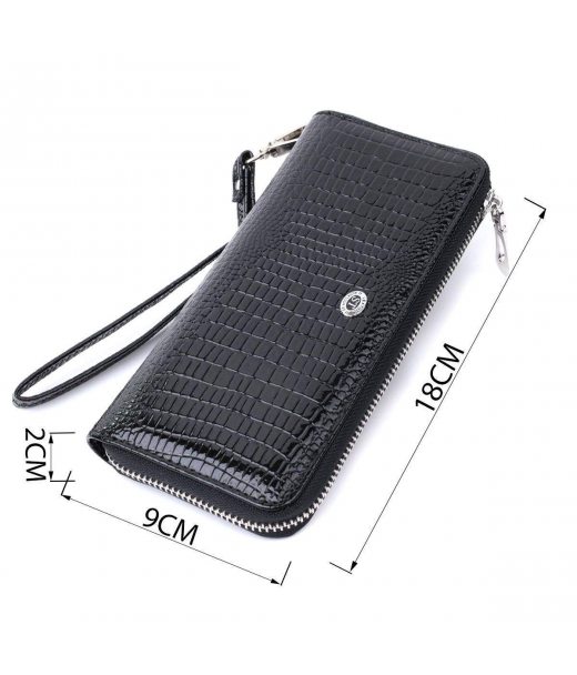 Відмінний гаманець-клатч для ділових та заповзятливих людей. Виконаний з м'якої першокласної лакованої шкіри високої якості з тисненням під рептилію. Колір виробу – чорний. Має одне основне відділення, яке закривається на блискавку. Усередині є багато відділень для купюр, осередків для карт та монетниця. Для зручності використання також передбачений знімний кистьовий ремінь. Запакований аксесуар у білу щільну картонну коробку з фірмовим логотипом.