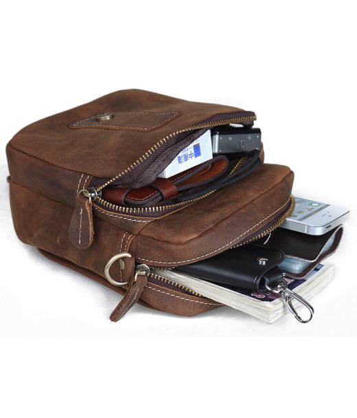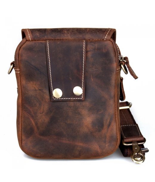 Матеріал: 100% натуральна яловича шкіра Розмір: 16.5 (L) cm X7 (W) cm X20 (H) cm Колір коричневий Вага: 0.5 кг Застібка шкіряна накидка на кнопці (замку) Фурнітура: метал, відтінку міді Опис: два містких автономних відділення на блискавці, відкритий кишеню для мобільного телефону, додаткове внутрішньо відділення на блискавці Зручний шкіряний ремінець дозволяє носити сумку на поясі Знімна шлейки з нейлону на міцних карабіни дозволяє підібрати максимально зручне положення для носіння вироби на плечі Помірно жорсткий каркас добре тримає форму Важливо! Кінська шкіра - груба, матова, товста шкіра, що тримає форму на невеликих та середніх виробах. Має вінтажний ефект, що нагадує наявність подряпин та потертостей - це не є дефектом. Перший час може залишати сліди на світлому одязі, що не є браком та швидко минає, "затираючись".