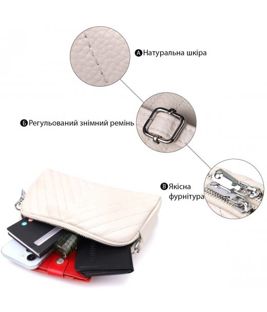 Біла шкіряна сумка з трикутним простроченням - це бездоганний вибір для тих, хто цінує легкість, стиль та увагу до деталей.