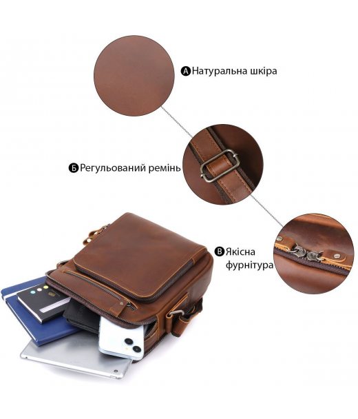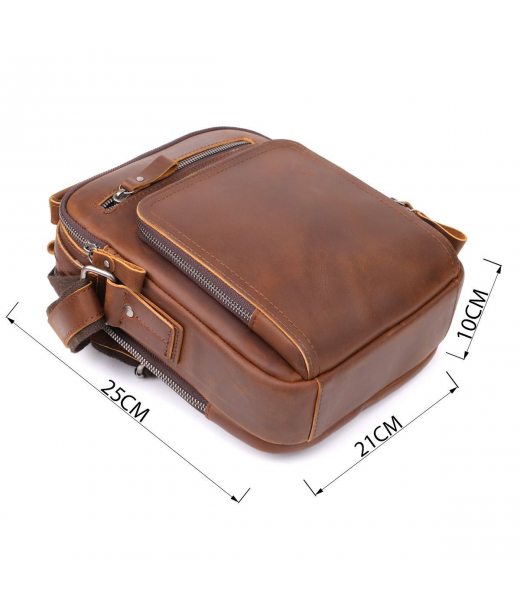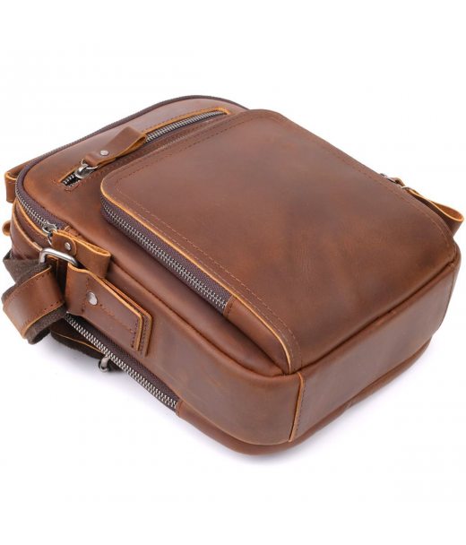 Коричнева шкіряна сумка через плече – стильний та практичний аксесуар на кожен день. Виготовлена з натуральної шкіри із виразною текстурою, доповнена фурнітурою кольору срібла. Модель оснащена двома основними відділеннями на блискавці, всередині – потайна кишеня на задній стінці. На лицьовому боці розміщено накладну кишеньку та горизонтальну вбудовану кишеню — обидві на блискавці. На тильній стороні розташована ще одна кишеня на блискавці. Зручність переноски забезпечують шкіряну ручку і незнімний регульований шкіряний ремінець через плече. Продумана конструкція та благородний колір роблять цю сумку ідеальним супутником для динамічного ритму життя.