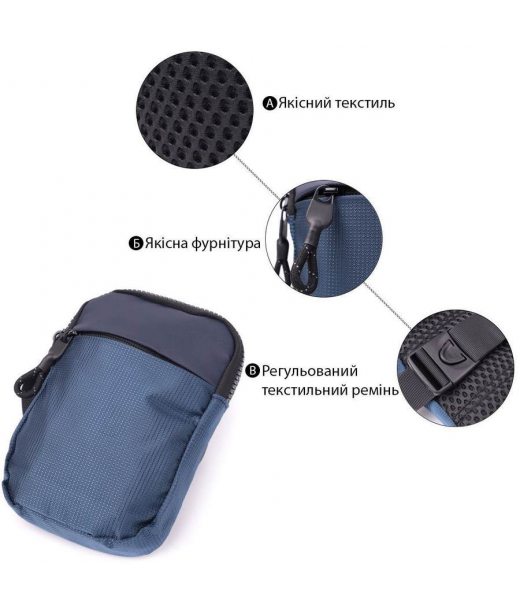 Перед Вами найпрактичніший варіант сумки - слінг бег, яка підійде як для повсякденного використання, так і в подорожі, коли всі цінні речі мають бути в безпечному місці та під рукою. Аксесуар виготовлений з якісного текстилю в комбінації синього та темно-синього кольору, що надає йому ексклюзивного вигляду та стилю. У моделі використано якісну фурнітуру чорного кольору. Сумка легко вміщує паспорт, телефон, ключі, гаманець та ще кілька дрібниць. Якщо Ви шукаєте зручну та легку сумку, яка задовольнить Вас за такими параметрами, як - міцність, практичність, місткість, ексклюзивність, універсальність, то ця модель перед Вами, вона має всі вищеперелічені якості та стане одним з Ваших улюблених аксесуарів.