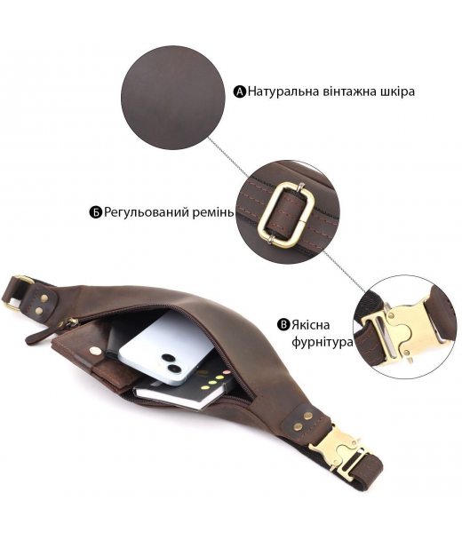 Чоловіча сумка-бананка з вінтажної коричневої шкіри стиль і практичність в одному аксесуарі. Ця сумка-бананка виконана із міцної натуральної вінтажної шкіри, яка надає їй характерного теплого відтінку та благородної текстури. Глибокий коричневий колір підкреслює природну красу матеріалу і робить виріб особливо виразним.