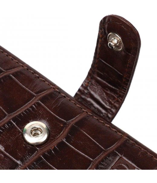 Стильне чоловіче портмоне з натуральної шкіри горизонтального типу з тисненням під крокодила. У цей аксесуар чудово поміщаються купюри всіх номіналів. Виріб складається з трьох відділень для купюр, трьох осередків для кредиток, трьох прихованих кишень, двох відділень під сіткою та монетниці. Закривається гаманець навпіл шкіряним хлястиком на кнопку. Вироби з натуральної шкіри завжди будуть чудовим подарунком для близької людини.