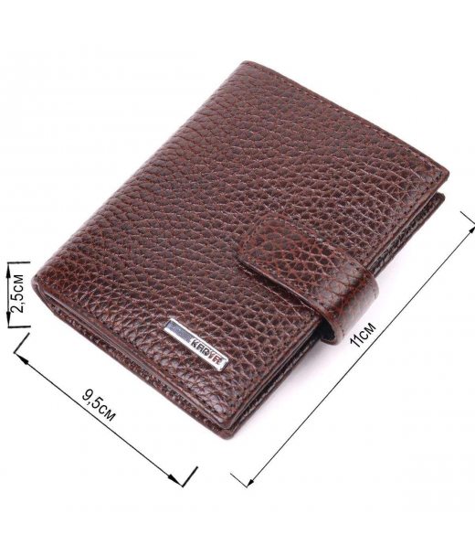 Практичний компактний портмоне з натуральної крупнозернистої шкіри, що закривається хлястиком на кнопку. Виріб має велику кишеню для купюр. Усередині достатньо осередків для кредиток. Виріб продуманий для сучасної людини. Виріб має насичений коричневий колір. Оригінальний аксесуар вигідно виділить вас із натовпу. Гаманець стане чудовим подарунком для Ваших близьких.