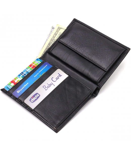 Універсальний чоловічий гаманець у класичному чорному кольорі з натуральної шкіри. Аксесуар має одне основне відділення з перегородкою, в яке поміщаються купюри всіх номіналів, шість кишень для карток, дві кишені під сіточкою для документів, монетницю та одну прилеглу кишеню. Закривається аксесуар навпіл без застібки. Запакований гаманець картонну коробку. Шкіряний гаманець є чудовим подарунком для рідних та близьких людей.