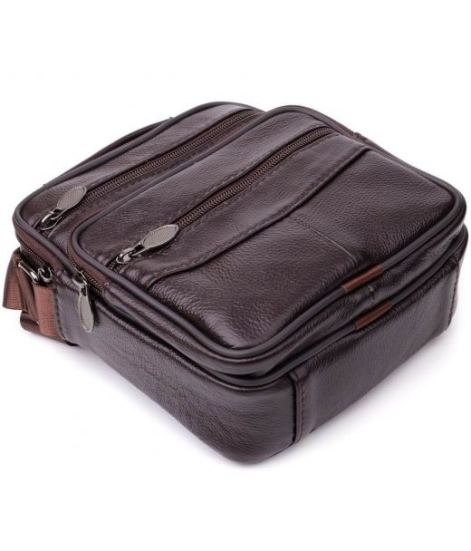 Зручна чоловіча сумка з високоякісної натуральної шкіри, стійка до зносу та дрібних пошкоджень. Модель оснащена одним містким основним відділенням та чотирма додатковими кишенями, які забезпечують зручне зберігання аксесуарів, документів, телефону та інших необхідних речей. Регульований плечовий ремінь виконаний із міцного текстилю, що гарантує комфорт при носінні, а також дозволяє підібрати оптимальну довжину. Коротка ручка робить сумку зручною для перенесення у руці. Красивий коричневий колір надає моделі універсальності та стилю, роблячи її чудовим вибором на кожен день як для ділових зустрічей, так і для повсякденного використання.