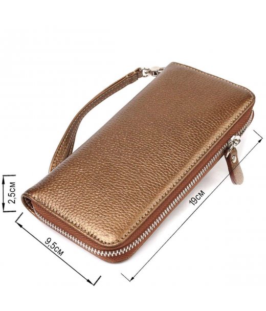 Дивовижний жіночий гаманець, з натуральної шкіри коричневого кольору з ледь вловимим золотавим блиском. Аксесуар має три основні відділення, в які поміщаються купюри всіх номіналів, дві перегородки, одна з них на блискавці, вісім кишень для карток, дві прилеглі кишені та знімний кистьовий ремінь. Закривається аксесуар на блискавку. Відмінний аксесуар, надійний виробник, який прослужить дуже довго.