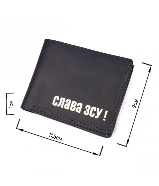 Чудовий шкіряний гаманець чорного кольору, з патріотичним написом "Слава ЗСУ". Виріб пошитий із якісної вінтажної шкіри, з високими показниками зносостійкості. Портмоне має одне велике відділення для купюр усіх номіналів, а також достатню кількість відділень для карток, без застібки. Шкіряний гаманець стане чудовим подарунком на всі випадки життя.