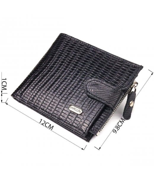 Надійне портмоне для чоловіків, із натуральної фактурної шкіри, у класичному чорному кольорі. Аксесуар має одне основне відділення з перегородкою, до якого вміщуються купюри всіх номіналів, дев'ять кишень для карток, дві з яких під сіточкою, монетницю на блискавці, п'ять прилеглих кишень, а також автономний блок для карт, який розташований в одній із прилеглих кишень. Закривається аксесуар хлястиком на кнопку. Колір фурнітури – срібло. Шкіряний гаманець є чудовим подарунком для рідних та близьких людей.