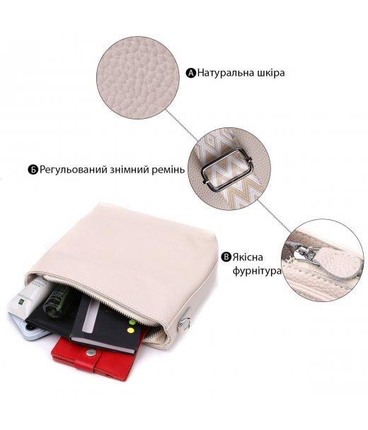 Елегантна сумка з натуральної шкіри у класичному білому кольорі – втілення стриманого стилю та універсальності. Модель оснащена одним основним відділенням, яке закривається на блискавку, забезпечуючи надійний захист речей. Усередині передбачені дві зручні кишені: потайна кишеня на блискавці - для зберігання цінних дрібниць, і відкрита - для предметів, до яких необхідний швидкий доступ.
