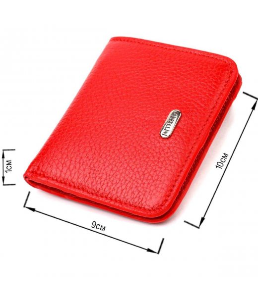 Практичний компактний гаманець із натуральної зернистої шкіри, в червоному кольорі, для суперстильних дівчат та жінок. Аксесуар має одне основне відділення з тканинною перегородкою в яке поміщаються купюри всіх номіналів, п'ять кишень для карток (одна під сіточкою), дві приховані кишені та монетницю. Закривається аксесуар навпіл на кнопку. На лицьовій стороні, вгорі посередині металевий логотип компанії виробника. Купуючи шкіряний аксесуар цієї фірми, собі чи на подарунок, будьте певні, що він прослужить Вам не один рік.