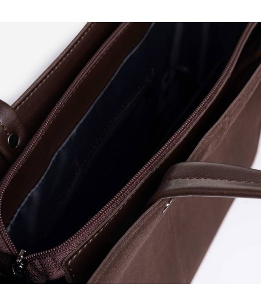 Сумка, с простым кроем и минимальной отделкой, выполнена из кожзаменителя высокого качества, чтобы ее использование было максимально длительным и приятным. Сумочка имеет две короткие ручки, которые рассчитаны на комфортную транспортировку в руке. В комплект входит длинный регулируемый ремешок. Задняя стенка оснащена врезным карманом на застежке. На дне установлены металлические ножки. Все изделие закрывается на молнию.