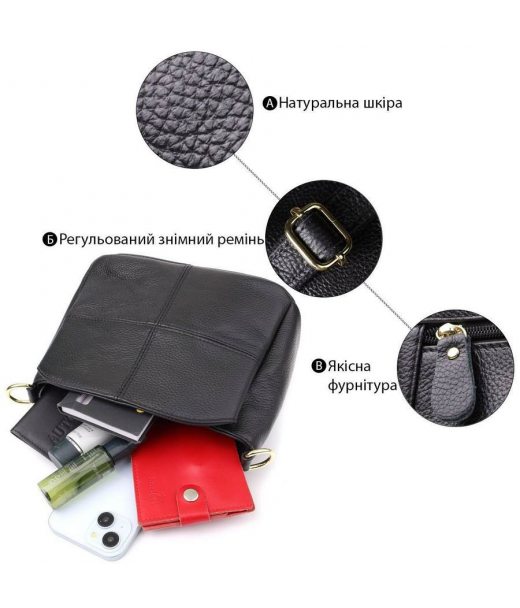 Эта черная кожаная сумка — идеальный выбор для женщины, ценящей строгую эстетику, практичность и высокое качество в каждой детали.