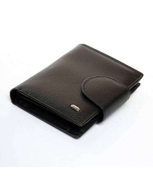 Кошелек изготовлен из натуральной кожи. Складывается вдвое и закрывается клапаном на кнопке.