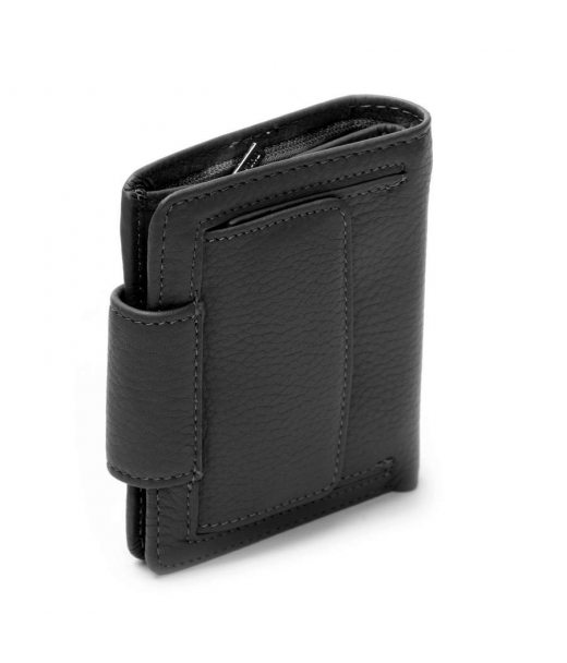 Внутри находятся два больших открытых отделения для банкнот (разделены кожаной перегородкой) и одно отделение на молнии. Также есть 12 карманов для визитных карт, 4 из которых выполнены прозрачными. Снаружи кошелька на обратной стороне есть монетница на кнопке.