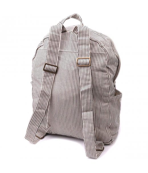 Универсальный рюкзак молочного цвета в черную вертикальную полоску из качественного текстиля. Рюкзак очень вместительный и имеет очень практичный функционал. Носить изделие можно в руках, для этого предусмотрена текстильная ручка, а также на спине благодаря регулируемым текстильным лямкам. Фурнитура которая использована в рюкзаке качественная, прослужит не один год.