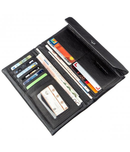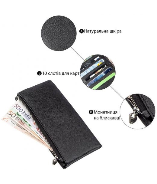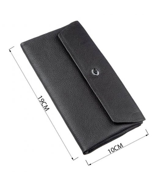 Незаурядный женский клатч на все случаи жизни из натуральной кожи. Выполнен в черном цвете, благодаря чему, подойдет под любой гардероб своей хозяйки. Вас обязательно удивит высокое качество данного аксессуара, а значит, он прослужит Вам очень долго. В данный кошелек-клатч поместится все необходимое, от денежных купюр до кредитных карточек. На тыльной стороне расположен карман на молнии для монет или других ценных мелочей, что очень удобно и практично. Вы можете приобрести изделие, как для себя любимой, так и на подарок близкому человеку. В любом случаи владелица кошелька останется довольной. Упакован клатч в фирменную коробку белого цвета из картона.