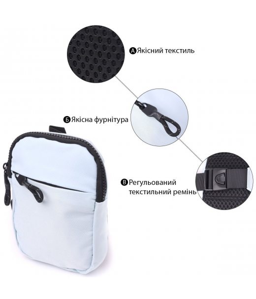 Перед Вами отличный вариант сумки слинг бег, которая подойдет как для повседневного использования, так и в путешествия, когда все ценные вещи должны быть в безопасном месте и под рукой. Аксессуар изготовлен из качественного текстиля голубого цвета, с контрастными вставками черного цвета, что придает ему эксклюзивного вида и стиля. В модели использована качественная фурнитура черного цвета. Сумка легко вмещает паспорт, телефон, ключи, кошелек и еще несколько мелочей. Если Вы ищете удобную и легкую сумку, которая удовлетворит Вас по таким параметрам, как - прочность, практичность, вместительность, эксклюзивность, универсальность, то эта модель перед Вами, она обладает всеми вышеперечисленными качествами и станет одним из Ваших любимых аксессуаров.