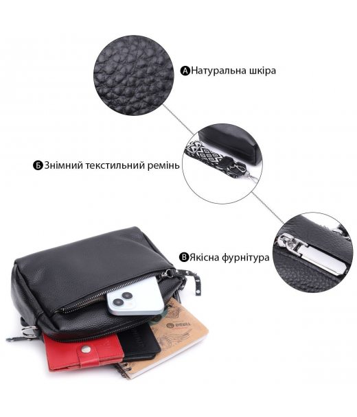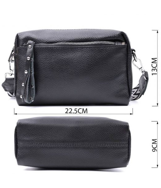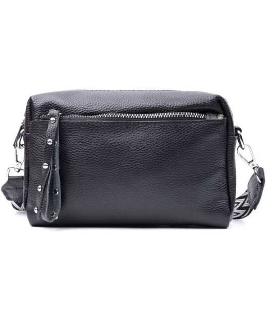 Практичная женская сумка в классическом черном цвете из натуральной кожи. Аксессуар состоит из основного отделения, что закрывается на молнию, кармана на молнии и кармана открытого типа внутри, двух карманов на молниях снаружи, на тыльной и лицевой стороне. Носить сумку можно на плече и через плечо, для этого имеется съемный текстильный ремень.