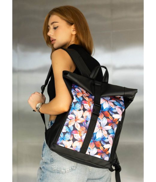 Женский рюкзак Sambag Roll Top One черный принт "Цветы"