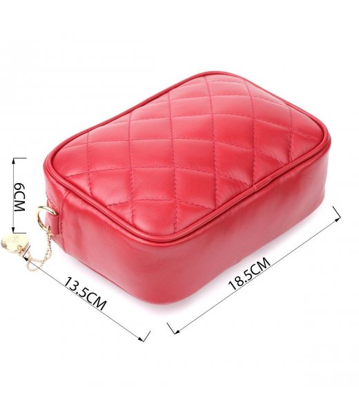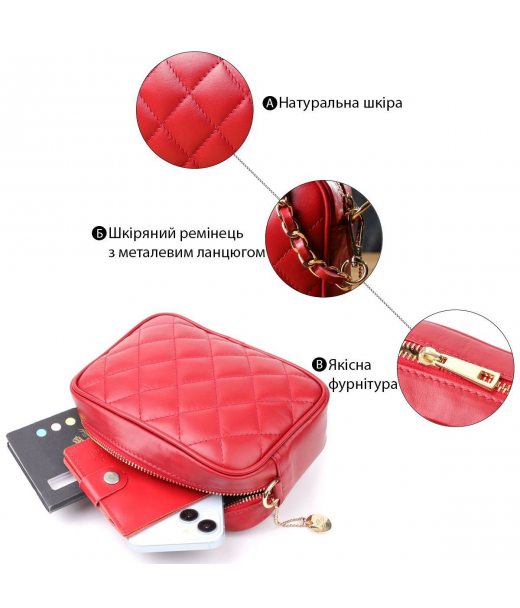 Компактная сумка из натуральной кожи в насыщенном красном цвете. Стеганая ромбами поверхность подчеркивает утонченный дизайн и добавляет аксессуару элегантности. Одно основное отделение позволяет удобно разместить все самое необходимое, сохраняя компактность и легкость. Ручка-цепочка длиной 135 см делает сумку универсальной: ее можно носить как на плече, так и через плечо. Такая деталь придает аксессуару современный характер и завершает образ стильной женщины.
