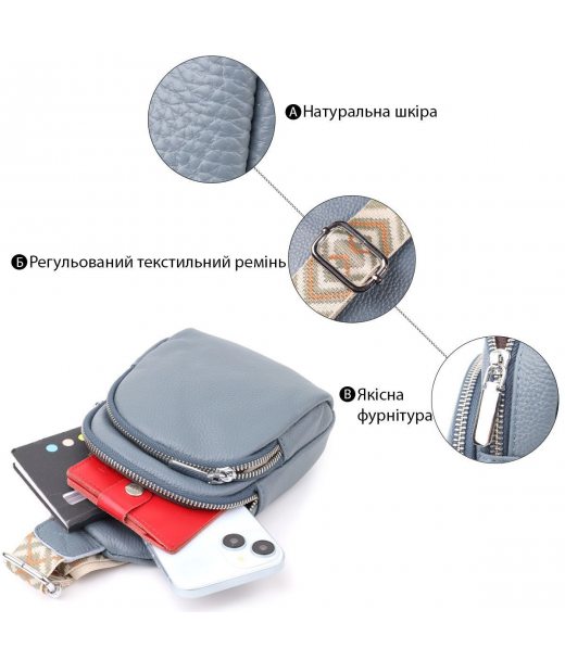 Особое внимание заслуживает регулируемый текстильный ремень с ярким стильным узором — он не только обеспечивает комфортную посадку на теле, но и становится выразительным элементом дизайна. Ремень несъёмный, но легко регулируется под ваш рост и способ ношения. Фурнитура выполнена в серебристом цвете, что придаёт аксессуару современный и сдержанный блеск, прекрасно сочетающийся с текстурой кожи и акцентами ремня.