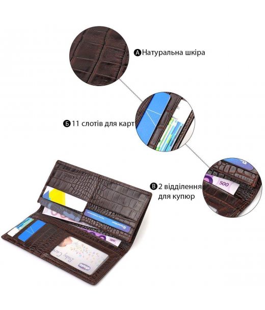 Интересный мужской кошелек из натуральной кожи с тиснением под крокодила. Аксессуар имеет одно основное отделение для купюр всех номиналов, одиннадцать ячеек для карточек, карман под сеточкой для пропуска, два скрытых кармана и монетницу на молнии. Закрывается аксессуар пополам без застежки. На лицевой стороне, в правом нижнем углу металлический логотип компании производителя. Приобретая кожаный аксессуар этой фирмы, себе или на подарок, будьте уверены, что он прослужит Вам не один год.