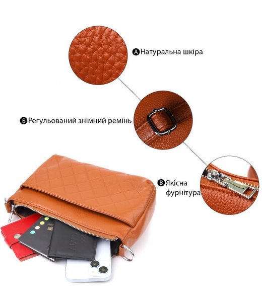 Стильная и практичная сумка из натуральной рыжей кожи, которая станет ярким акцентом в вашем образе. Основное отделение сумки закрывается на надежную молнию, обеспечивая безопасность ваших вещей. Внутри расположены удобный потайной карман на молнии — идеальное место для хранения ценных мелочей, и карман открытого типа для быстрого доступа к необходимым предметам.