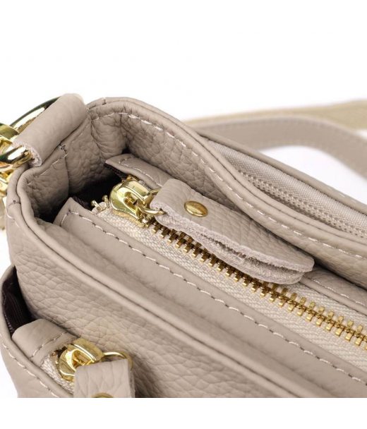 Сумка оснащена одним съёмным кожаным ремешком, который можно носить на плече или через плечо, делая аксессуар максимально универсальным и комфортным. Фурнитура выполнена в тёплом цвете жёлтого золота, добавляющем контраст и изысканность к сдержанному серому оттенку кожи.