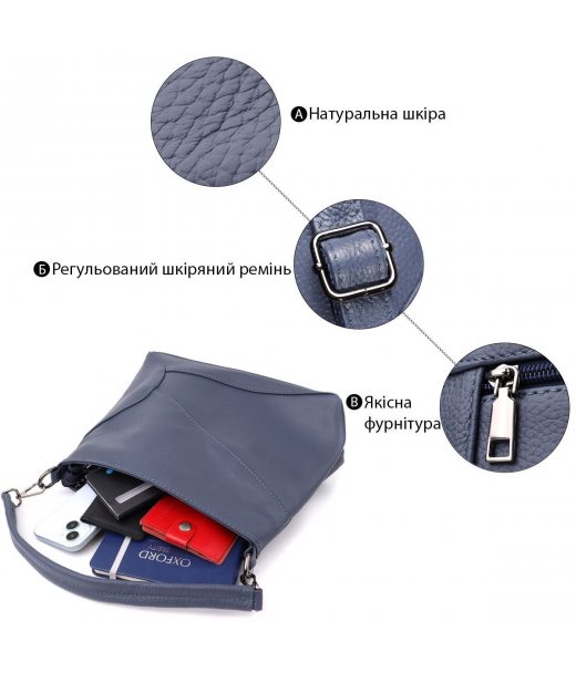 Фурнитура под серебро гармонично сочетается с насыщенным синим цветом кожи, подчеркивая стильный характер сумки. Два съемных кожаных ремешка дают возможность носить её на плече, через плечо или в руках, легко подстраиваясь под ваш ритм жизни и предпочтения.