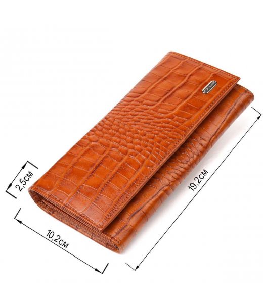 Изделие выполнено из натуральной фактурной кожи рыжего цвета с тиснением под крокодила. Материал выглядит эффектно, приятен на ощупь и хорошо подходит для ежедневного использования. Горизонтальный формат делает модель удобной для тех, кто ценит вместительность и порядок в вещах.