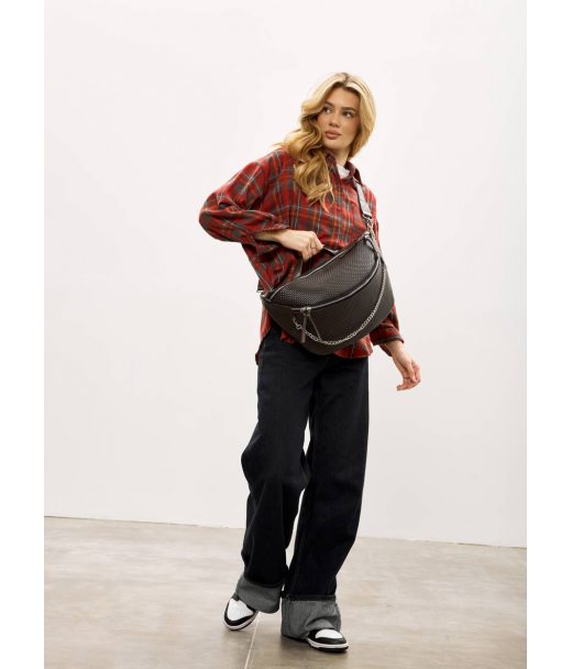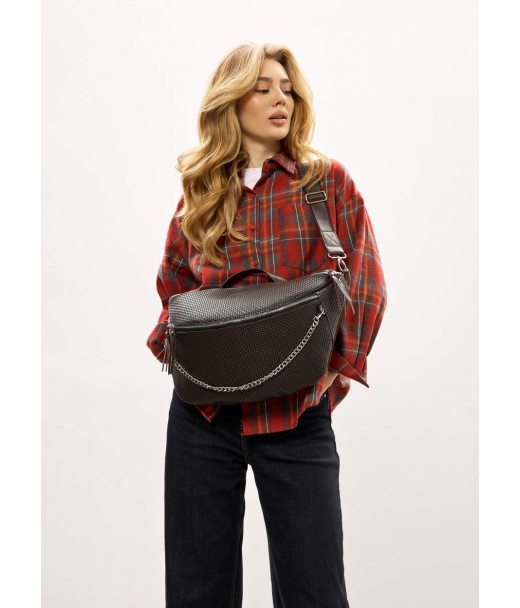 Блискавки та подвійні металеві YKK бігунки. Сумка оснащена регульованим плечовим ременем, що кріпиться до сумки за допомогою надійних металевих карабінів. На ремні пластиковий фастекс та регулятор довжини. Загальний обват 190 см. Модель доповнена декоративним металевим ланцюжком, який є з'ємним — за бажанням його можна зняти для більш стриманого образу.