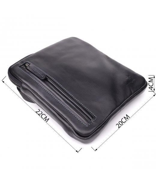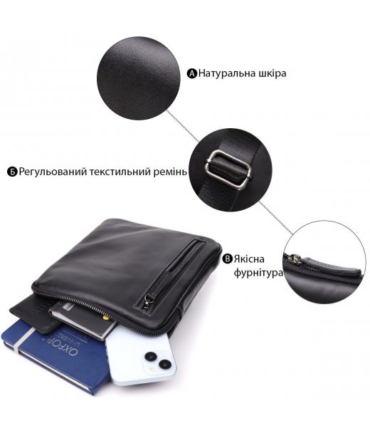 Елегантна чоловіча вертикальна сумка із натуральної гладкої шкіри глибокого чорного кольору. Мінімалістичний дизайн та акуратне оздоблення підкреслюють статус власника та роблять аксесуар універсальним для будь-якого стилю – від класичного до повсякденного.