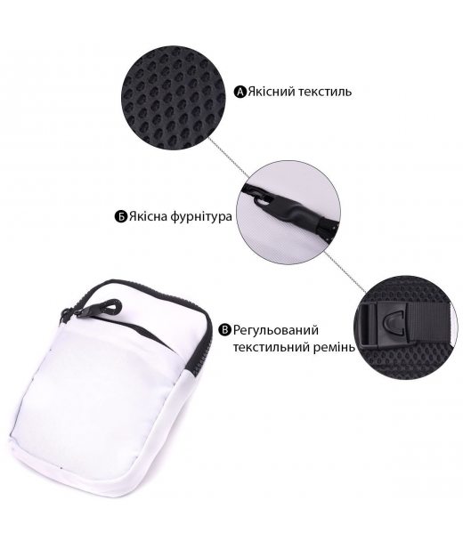Представляємо відмінний варіант сумки слінг бег, яка підійде як для повсякденного використання, так і подорожі, коли всі цінні речі повинні бути в безпечному місці і під рукою. Аксесуар виготовлений з якісного текстилю білого кольору, з контрастними вставками чорного кольору, що надає йому ексклюзивного вигляду та стилю. У моделі використано якісну фурнітуру чорного кольору. Сумка легко вміщує паспорт, телефон, ключі, гаманець та ще кілька дрібниць. Якщо Ви шукаєте зручну та легку сумку, яка задовольнить Вас за такими параметрами, як - міцність, практичність, місткість, ексклюзивність, універсальність, то ця модель перед Вами, вона має всі вище перелічені якості та стане одним з Ваших улюблених аксесуарів.