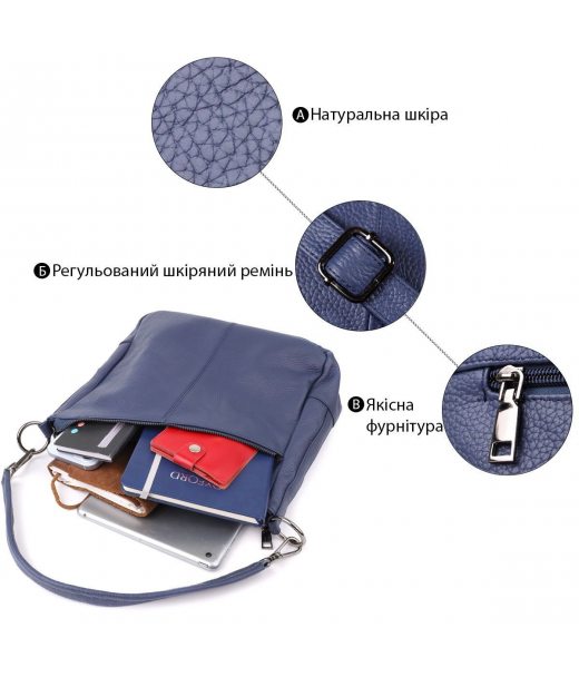 Синя шкіряна сумка з трьома відділеннями - це гармонійне поєднання стилю, практичності та якості, яке підкреслить ваш смак та підійде під будь-який гардероб.