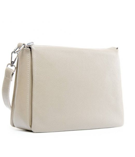 Виготовлена з натуральної м'якої шкіри. Закривається на блискавку. Всередині знаходяться три відділення, розділені кишенею-перегородкою. Середнє відділення додатково закривається на блискавку, а всередині знаходиться бічна відкрита кишеня і кишеня на блискавці. Зовні сумки на зворотному боці розташована кишеня на блискавці.
