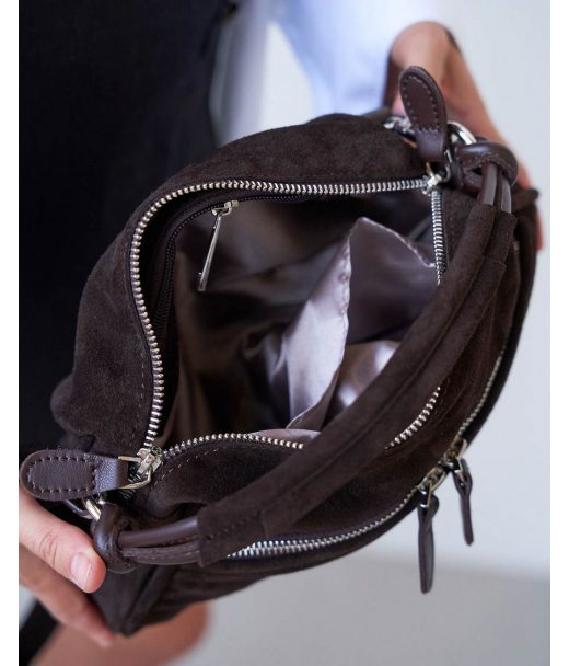 Жіноча сумка K73455, колір коричневий, матеріал сумки натуральна шкіра, замша. Сумка відкривається за допомогою блискавки. Усередині сумка має одну відкриту кишеню та кишеню на блискавці. Зовні є кишеня для дрібних речей.