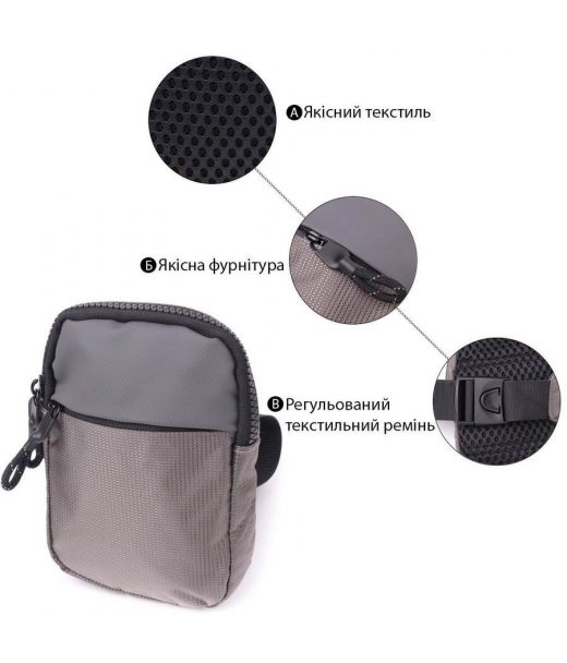 Перед Вами найзручніший варіант сумки слінг бег, яка підійде як для повсякденного використання, так і подорожі, коли всі цінні речі повинні бути в безпечному місці і під рукою. Аксесуар виготовлений з якісного текстилю сірого кольору, з контрастними вставками чорного кольору, що надає йому ексклюзивного вигляду та стилю. У моделі використано якісну фурнітуру чорного кольору. Сумка легко вміщує паспорт, телефон, ключі, гаманець та ще кілька дрібниць. Якщо Ви шукаєте зручну та легку сумку, яка задовольнить Вас за такими параметрами, як - міцність, практичність, місткість, ексклюзивність, універсальність, то ця модель перед Вами, вона має всі вище перелічені якості та стане одним з Ваших улюблених аксесуарів.