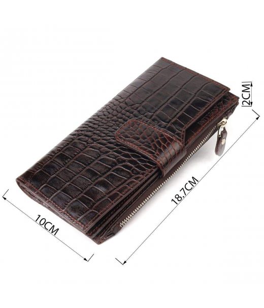 Місткий жіночий гаманець з натуральної фактурної шкіри з тисненням під крокодила. Аксесуар має шість прилеглих кишень, у які помістяться купюри всіх номіналів, містку монетницю та двадцять кишень для карток. Закривається аксесуар хлястиком на кнопку. Якщо Ви хочете порадувати себе та здивувати близьких, то неодмінно купуйте шкіряні аксесуари в нашому магазині, якість і ціна Вас однозначно порадує.